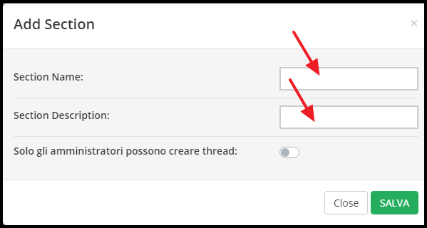Apparirà un pop-up. Immettere il nome della Sezione preferito e una Descrizione nei campi vuoti.