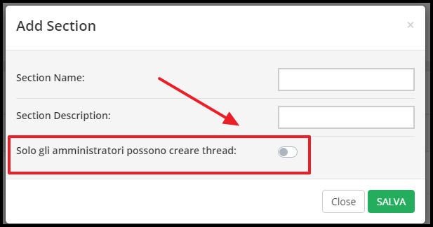 Solo gli amministratori possono creare thread: consente di attivare / disattivare questa opzione