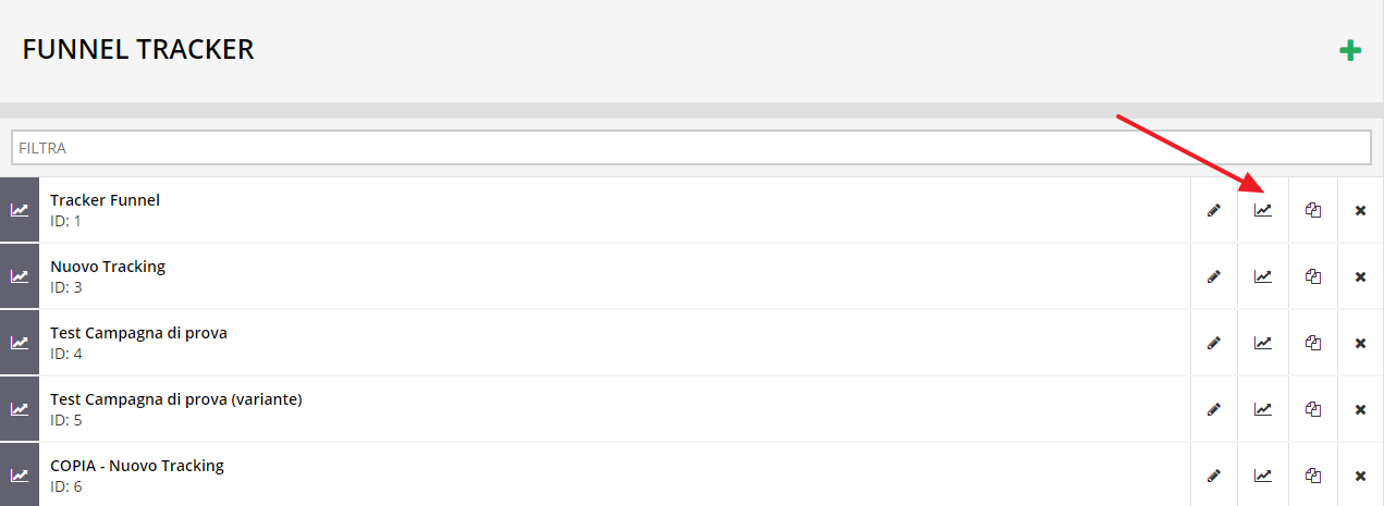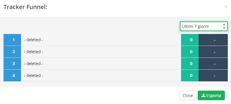 Funnel Tracker è una funzione (che trovi nella dashboard sotto Statitistiche) in cui è possibile visualizzare l'elenco dei funnel creati, puoi crearne uno nuovo, modificare, visualizzare il risultato ed eliminare.